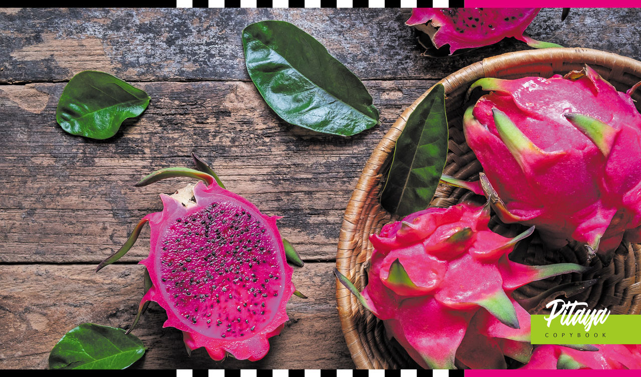 1. Composition of fresh pitayas in a wicker basket on a brown wooden table 2. Composition of sliced and cubed pitayas on a white wooden table 3. Composition of pitaya and exotic fruit mix on a grey textured background 4. Composition of slices of dragon fruit in a seamless pattern on pastel blue
