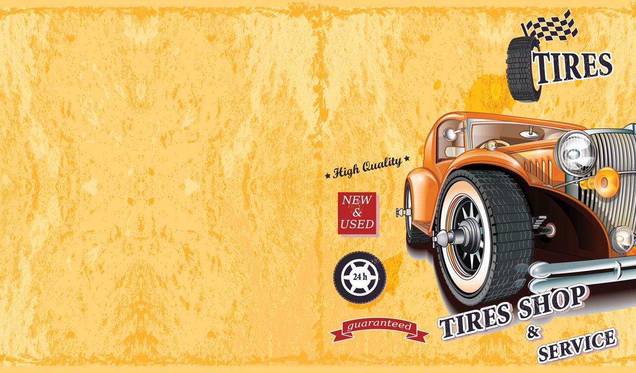 Advertising poster of an orange retro car in a tires shop and service on a yellow grunge parchment texture background with logos.