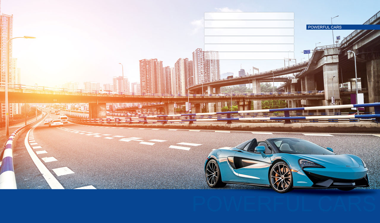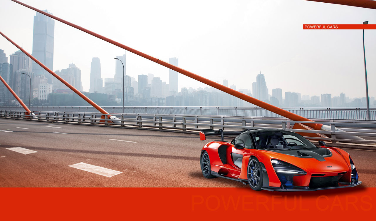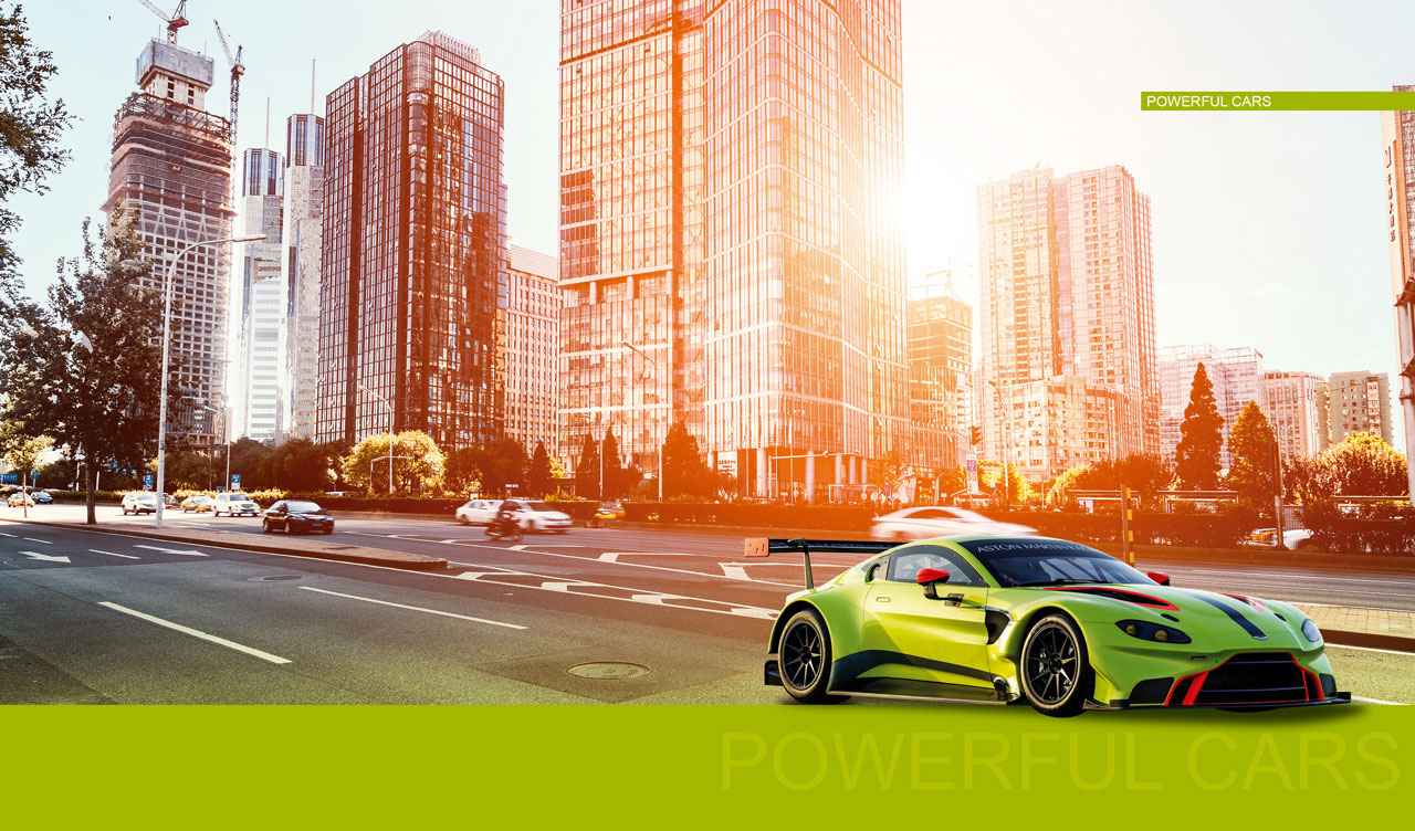 1. Luxurious yellow SUV drives down the brown-grey highway in the pale sunlight 2. Red mid-engine sports car on the bridge against urban white landscape 3. Matte metallic rose gold luxury crossover drives under the interchange viaduct 4. Lime green GTE racing car drives down the highway in the sepia sunlight 5. Sky blue sports car drives under the interchange viaduct in the pale sunlight