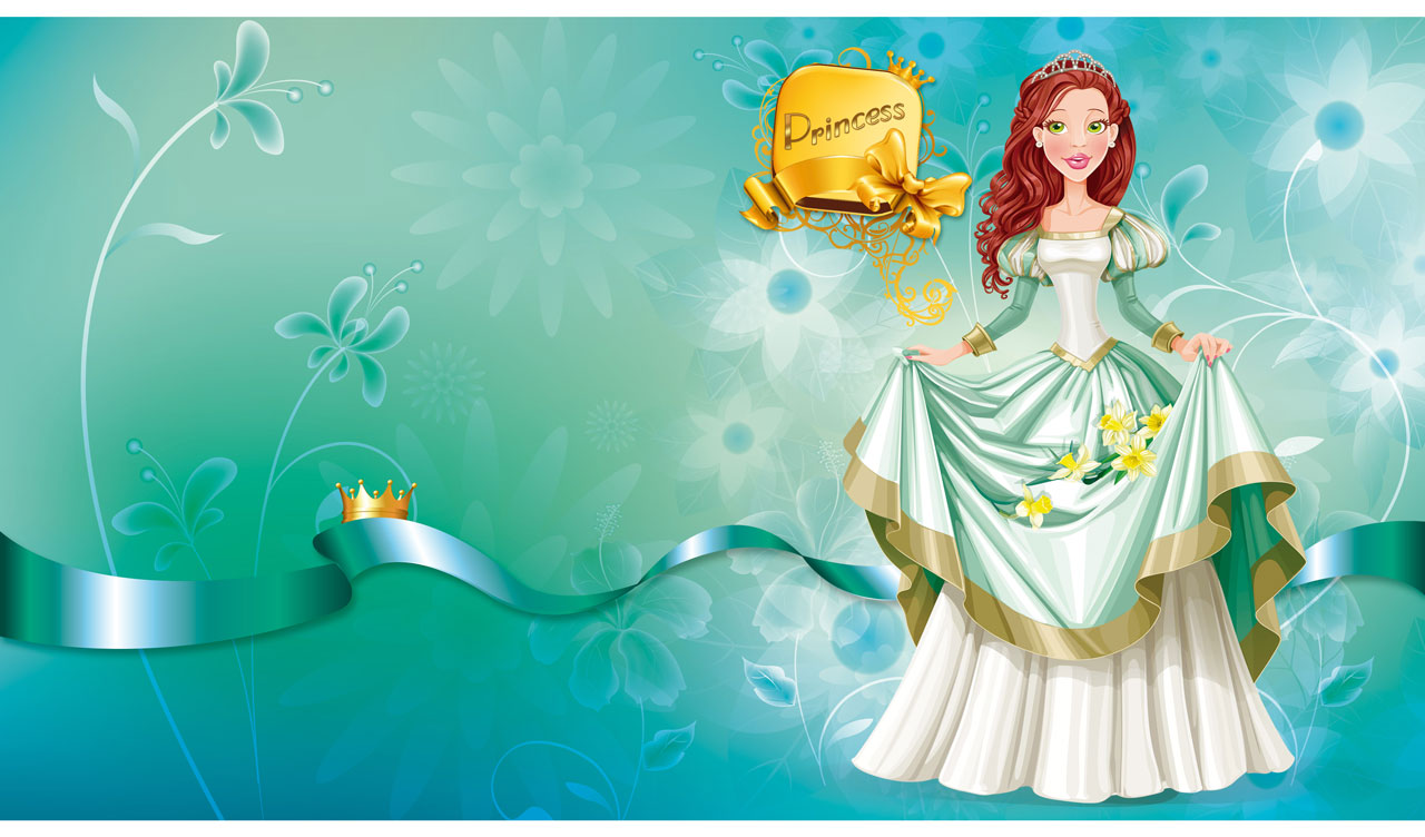 1. Red hair princess in white-green silk dress against a teal floral silhouette 2. Blonde princess in a pink dress drinks tea against an orange floral silhouette 3. Golden hair princess on white horse against a purple floral silhouette 4. Blonde princess in a cone hat against an orange-pink floral silhouette 5. Golden hair princess in a teal dress holds tulips against a blue floral silhouette 6. Brown hair princess in a pink dress holds toys against a purple floral silhouette