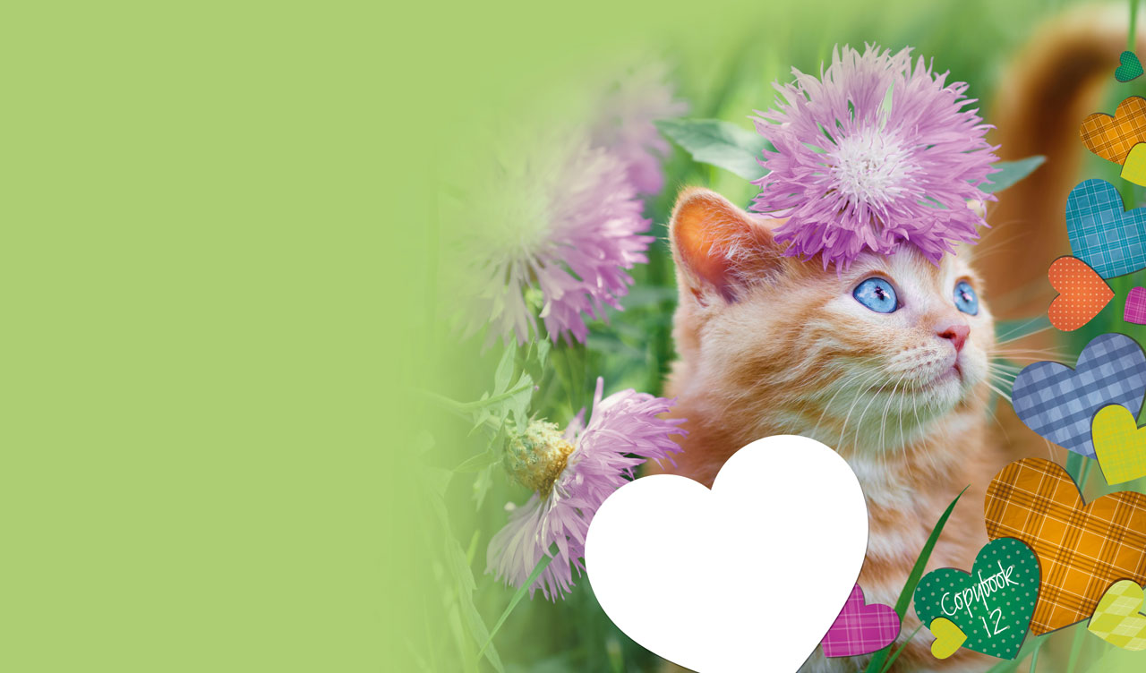 1. Gray tabby kitten on a mossy rock in a white vignette with colorful hearts 2. Sleepy red kitten lying on grass on a dark lime background with colorful hearts 3. White and red kitten in a tea cup on a white pastel background with colorful hearts 4. Red kitten in a field of purple flowers in a green vignette with colorful hearts 5. Ginger kitten hides between the towels in a white vignette with colorful hearts