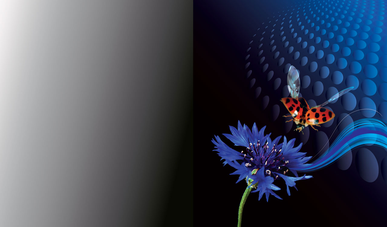 1. Orange-white butterflies on a pink hydrangea on green to black techno gradient 2. Bee flies over a yellow blooming tulip on yellow to black techno gradient 3. Ladybug flies over a blue blooming cornflower on blue to black techno gradient 4. Luna moth flies on a scarlet red leaf on a red to black techno gradient