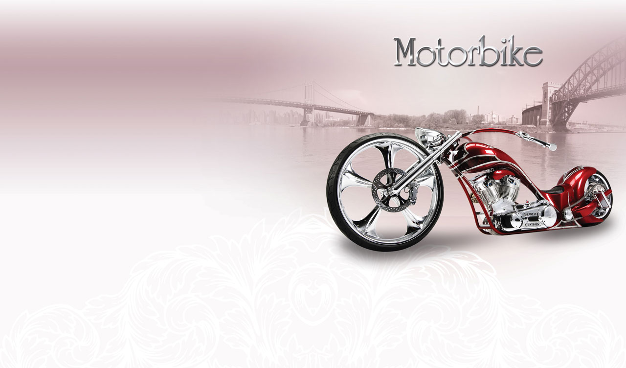 Red and chrome chopper motorcycle against a pastel pink monochromatic cityscape of an embankment adorned with white floral pattern.