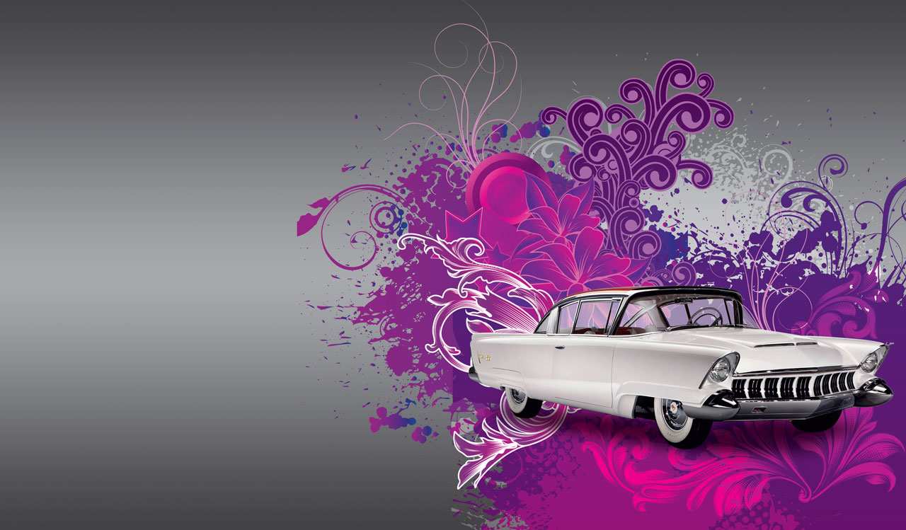 2. Retro Mercury XM-800 cabriolet on purple blot and floral stencils on grey