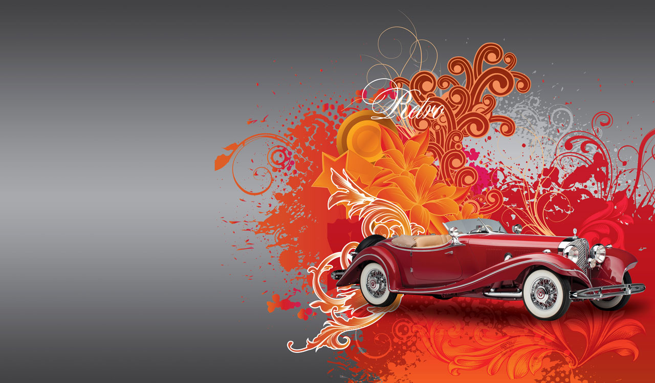Retro Mercedes-Benz 500K cabriolet on red blot and floral stencils on grey