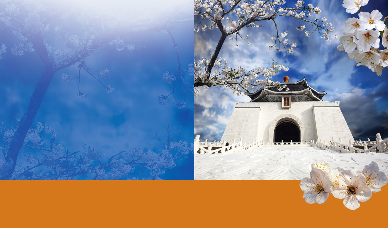 1. A tan landscape of cherry blossom by the gazebo on the Sun Moon Lake 2. National Chiang Kai-Shek Cultural Center in a frame of pink cherry blossoms 3. White cherry blossoms in front of the National Chiang Kai-Shek Memorial Hall 4. Sakura and a bonsai tree in front of the National Chiang Kai-Shek Memorial Hall
