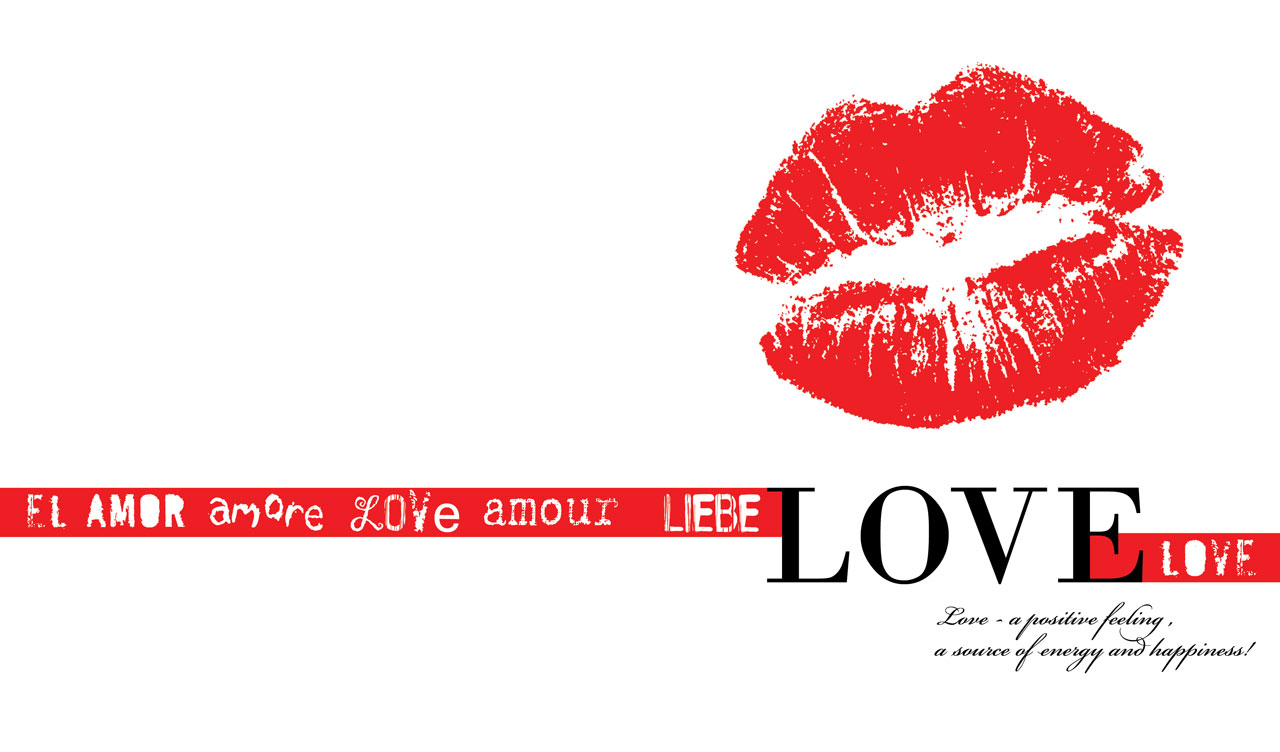 Scarlet red lipstick print with a vinyl love quote decal and a red horizontal stripe against a white background.