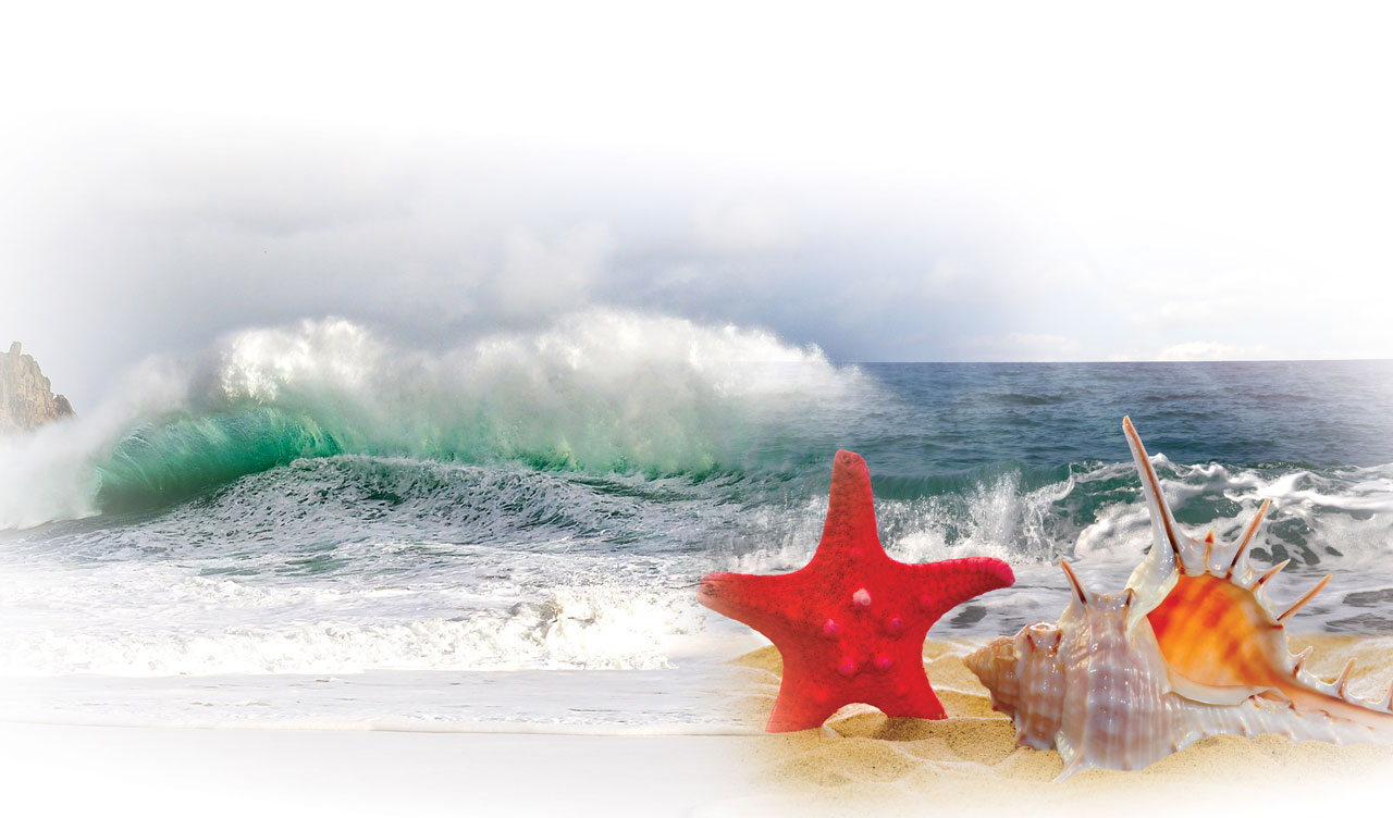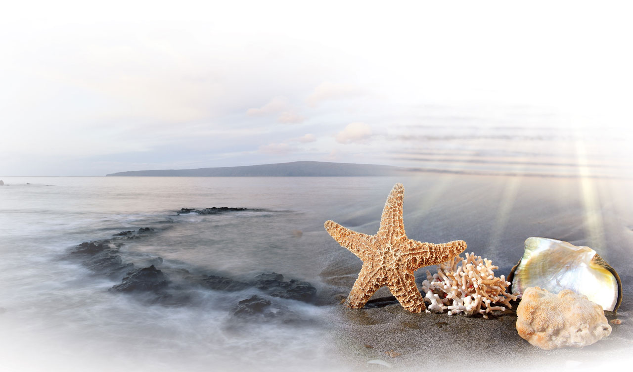1. Red starfish and two marble thorn conch seashells on wave-washed seashore 2. Golden starfish, marble corals and seashell on gray sand of a rocky coral reef 3. Big murex shell with black spikes and red starfish lay in the sand in front of sea 4. A marble pearl in an open shell on a seashore washed by emerald waves