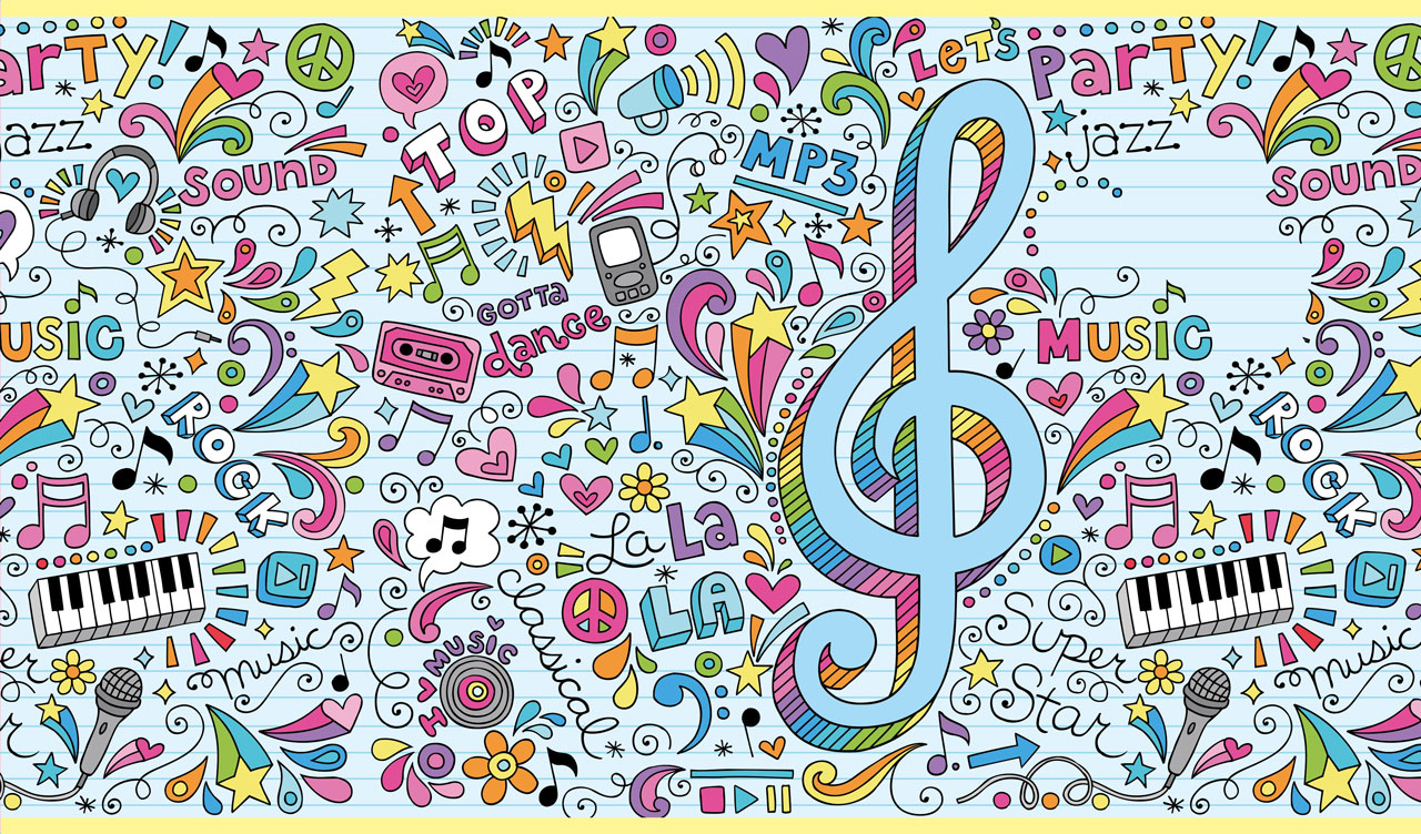 Seamless Music Party pattern with colorful g clef, mics, stars and keyboards on a pastel blue background.
