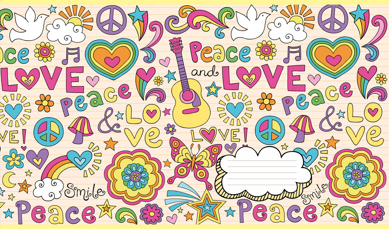 Seamless Music Party pattern with colorful peace signs, guitars, flowers, hearts and doves on a pastel beige background.
