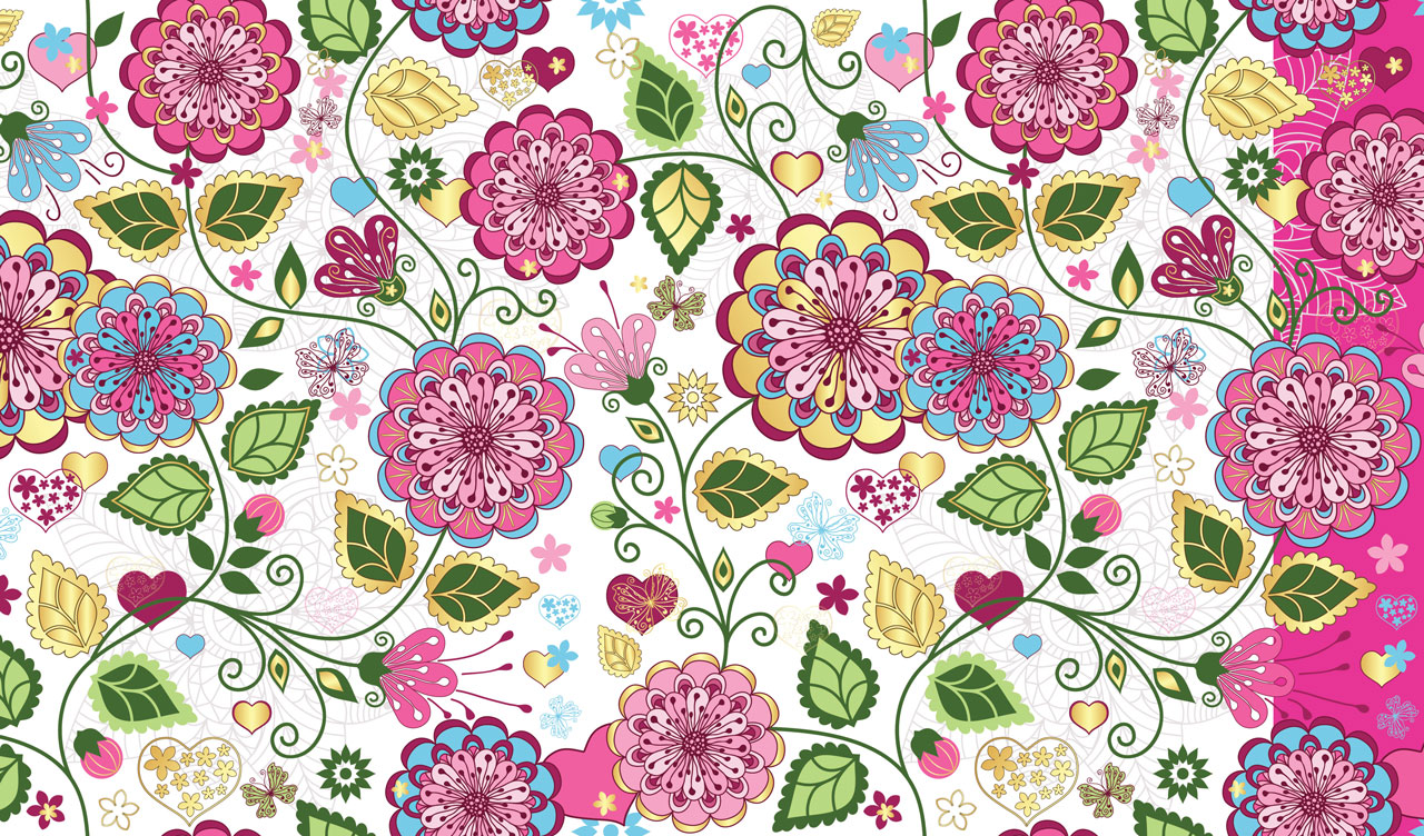 Seamless pattern of flowers with pink, pastel blue, golden petals and pastel green leaves on a white with pink sidebar.