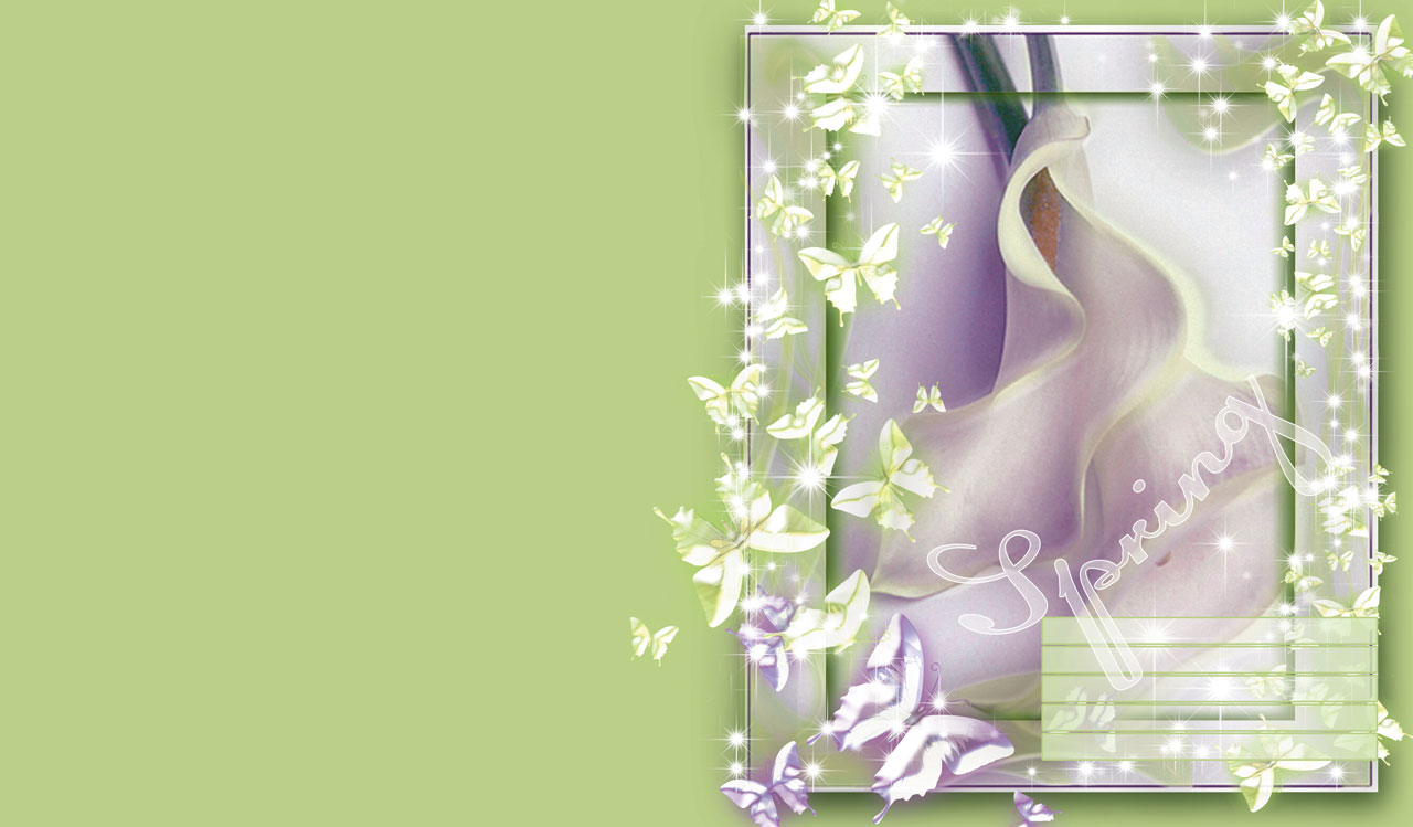 2. Spring theme lilac calla flower in a white frame with sparkling butterflies on a light green