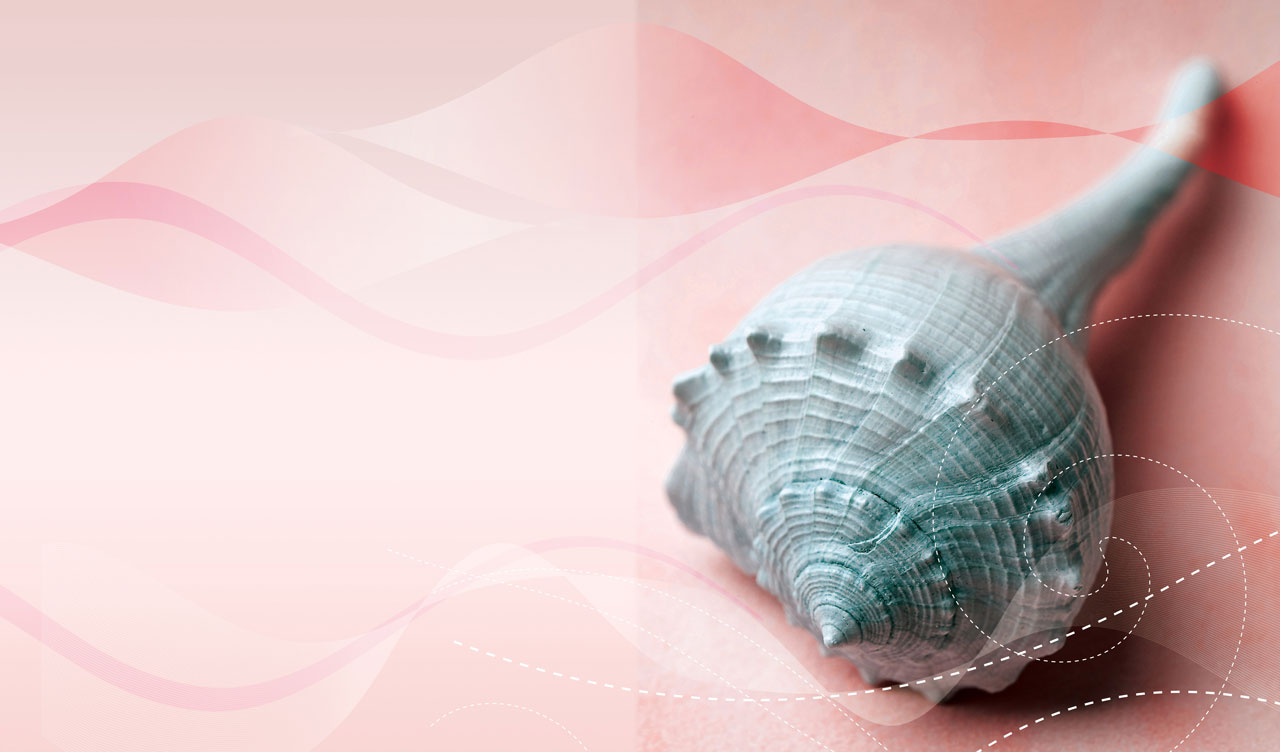 1. Marble seashell and starfish against blue wavy pattern gradient 2. Pale turquoise seashell against a pastel pink wavy pattern gradient 3. Two marble seashells against a light blue wavy pattern gradient 4. Two marble seashells against a light violet wavy pattern gradient