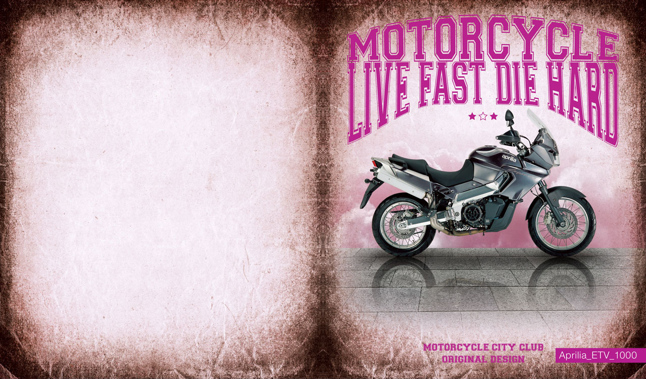 A silver motorcycle Aprilia ETV 1000 model from City Club LFDH on a pastel pink background in a brown leather textured vignette.