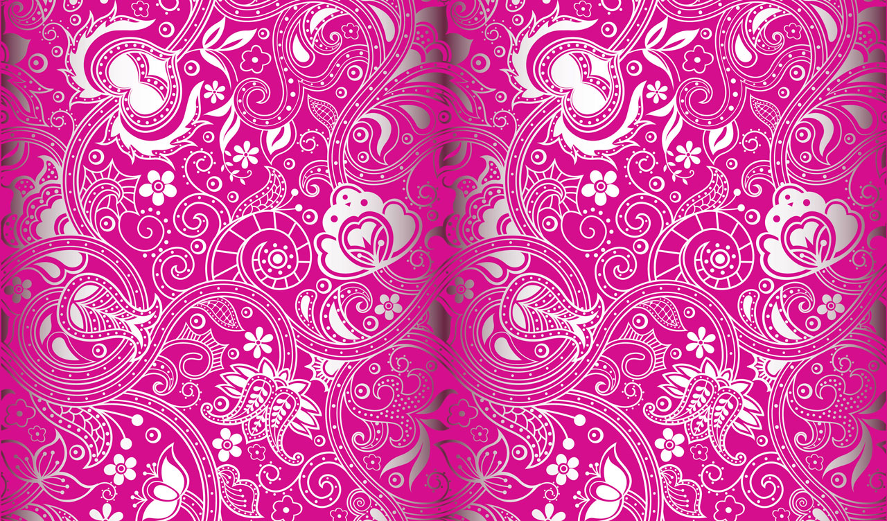 1. Silver floral batik ornament on a red backdrop 2. Silver floral batik ornament on a navy blue backdrop 3. Silver floral batik ornament on a light green backdrop 4. Silver floral batik ornament on fuchsia backdrop 5. Silver floral batik ornament on a dark orange backdrop