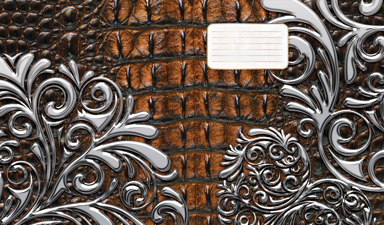 Swirl design in the shape of silver ornaments stenciled on brown leather texture.