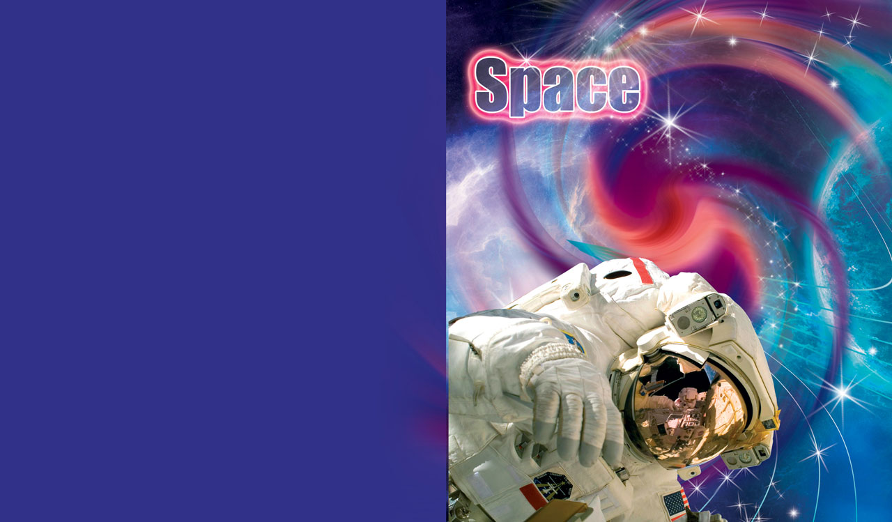 3. Astronaut in a white spacesuit moves in open space through a purple-blue spiral galaxy