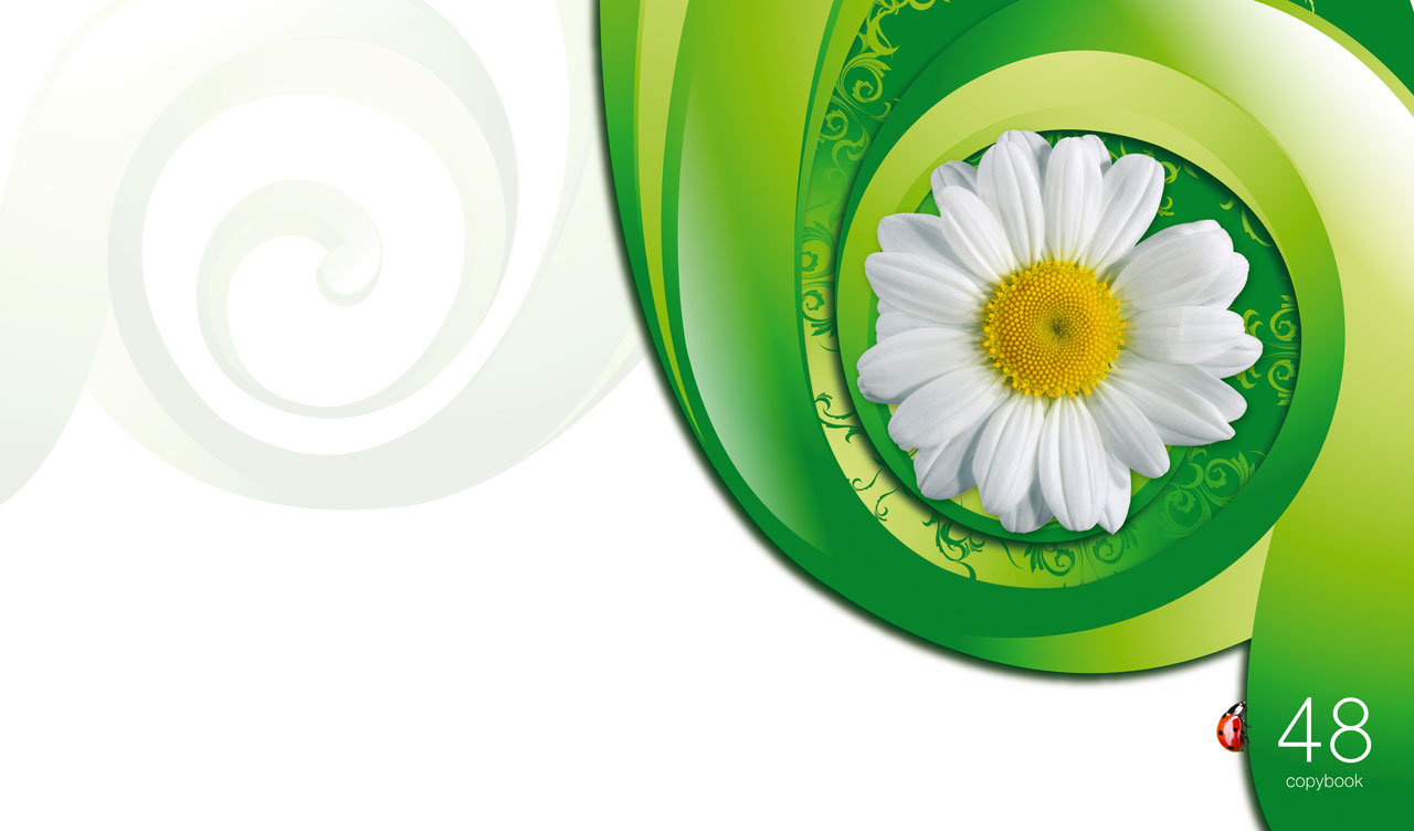 1. Digital art displays a red daisy on red spiral on a white backdrop 2. Digital art displays a white chamomile on green spiral on a white backdrop 3. Digital art displays a scabiosa flower on fuchsia spiral on a white backdrop 4. Digital art displays a yellow daisy on orange spiral on a white backdrop 5. Digital art displays a white dahlia on violet-blue spiral on a white backdrop