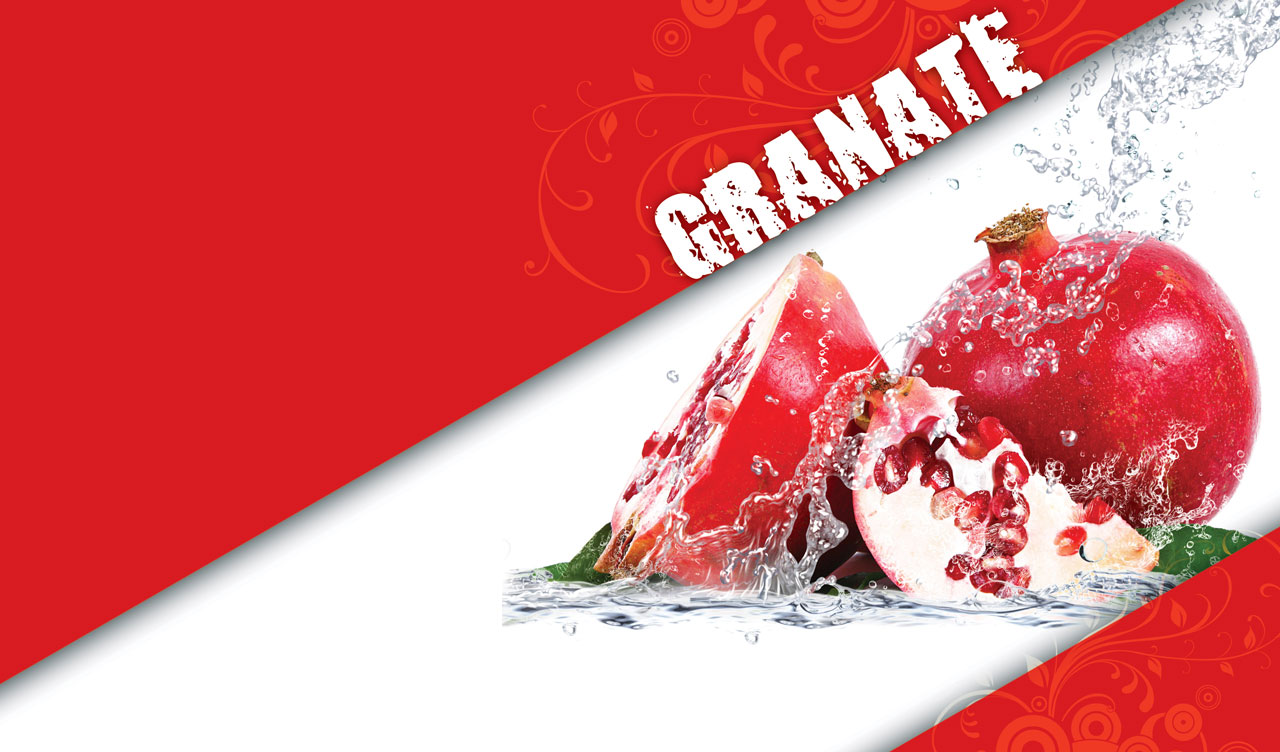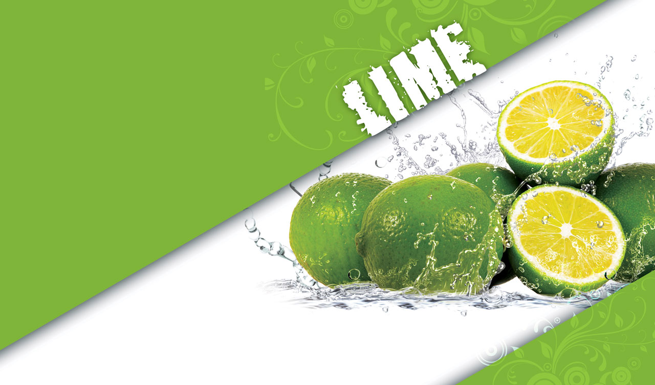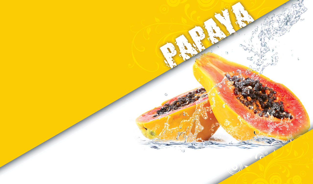 1. Lime cut in half among the green limes in the water splashes 2. Pomegranate cut into pieces next a red pomegranate in the water splash 3. Ripe papaya with black seeds cut in half in the water splash 4. Coconut cut in half in the splashes of coconut milk