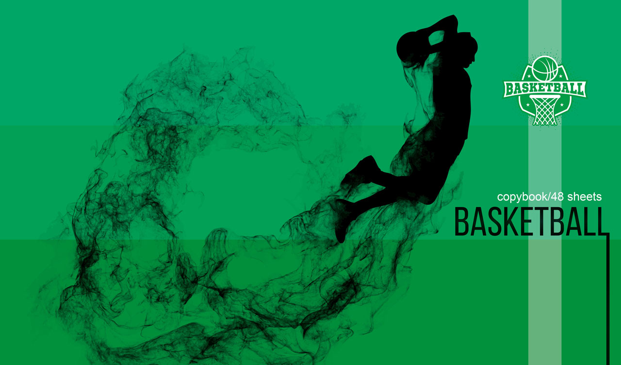 1. A silhouette of a soccer player executing a bicycle kick on red 2. A silhouette of a soccer player executing a chest trap on red-pink 3. A silhouette of a basketball player executing a slam dunk on purple 4. A silhouette of a basketball player executing a backscratcher dunk on green 5. A silhouette of an American football player running fast on orange