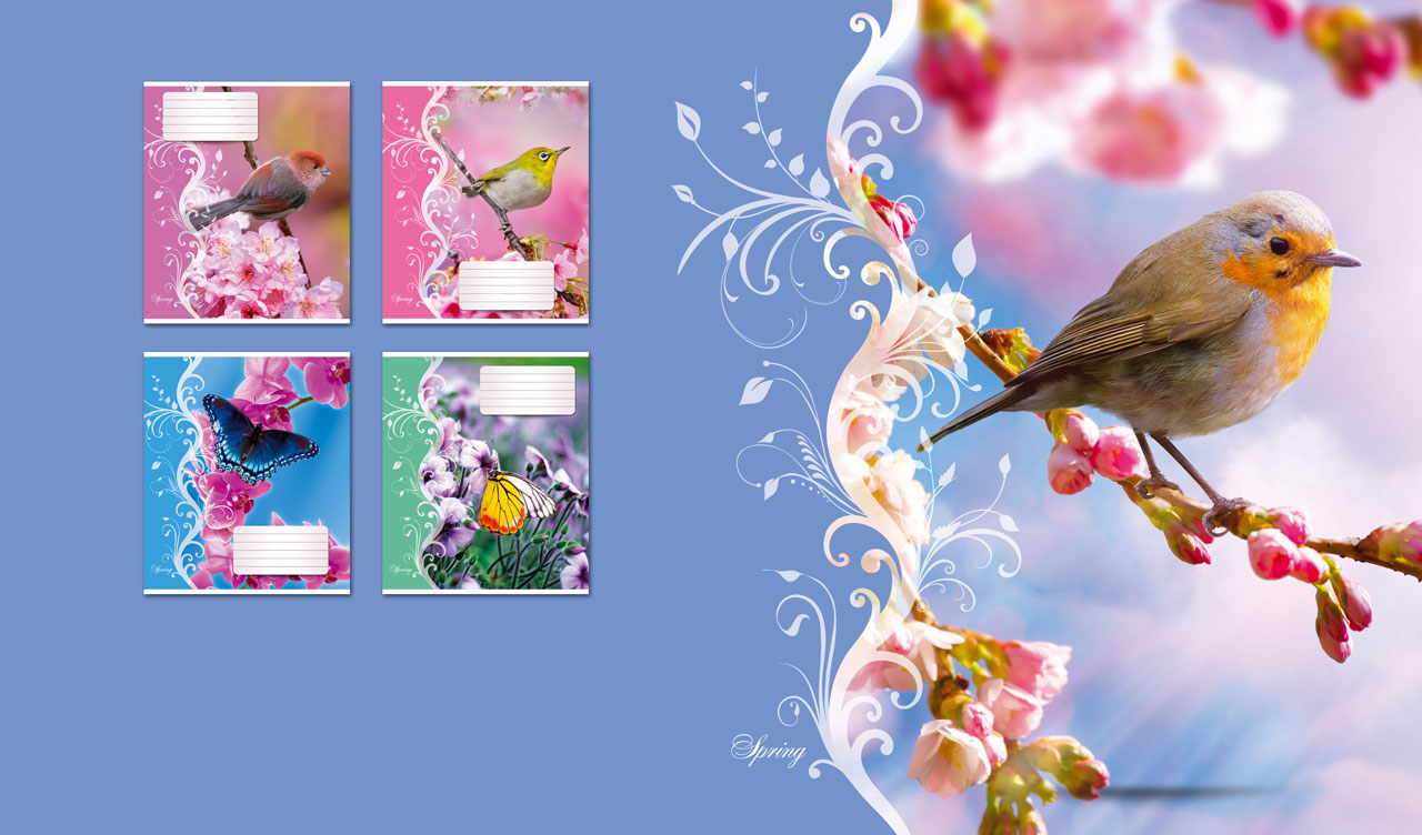 1. Warbling white-eye bird and sakura on a pink backdrop with floral decor 2. Vinous-throated parrotbill and sakura on a pink-purple backdrop with floral decor 3. Indian Jezebel butterfly and violet flowers on a light green backdrop with floral decor 4. European robin on a flowering tree on light navy backdrop with floral decor
