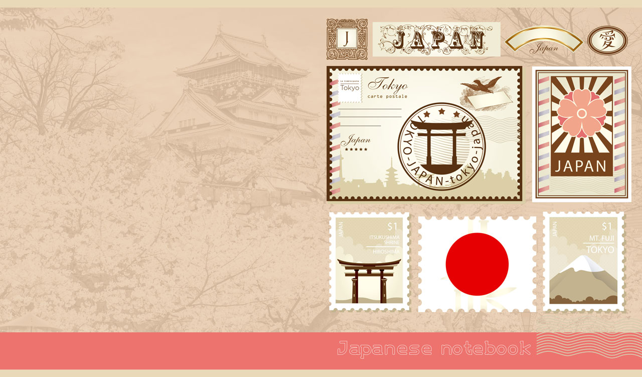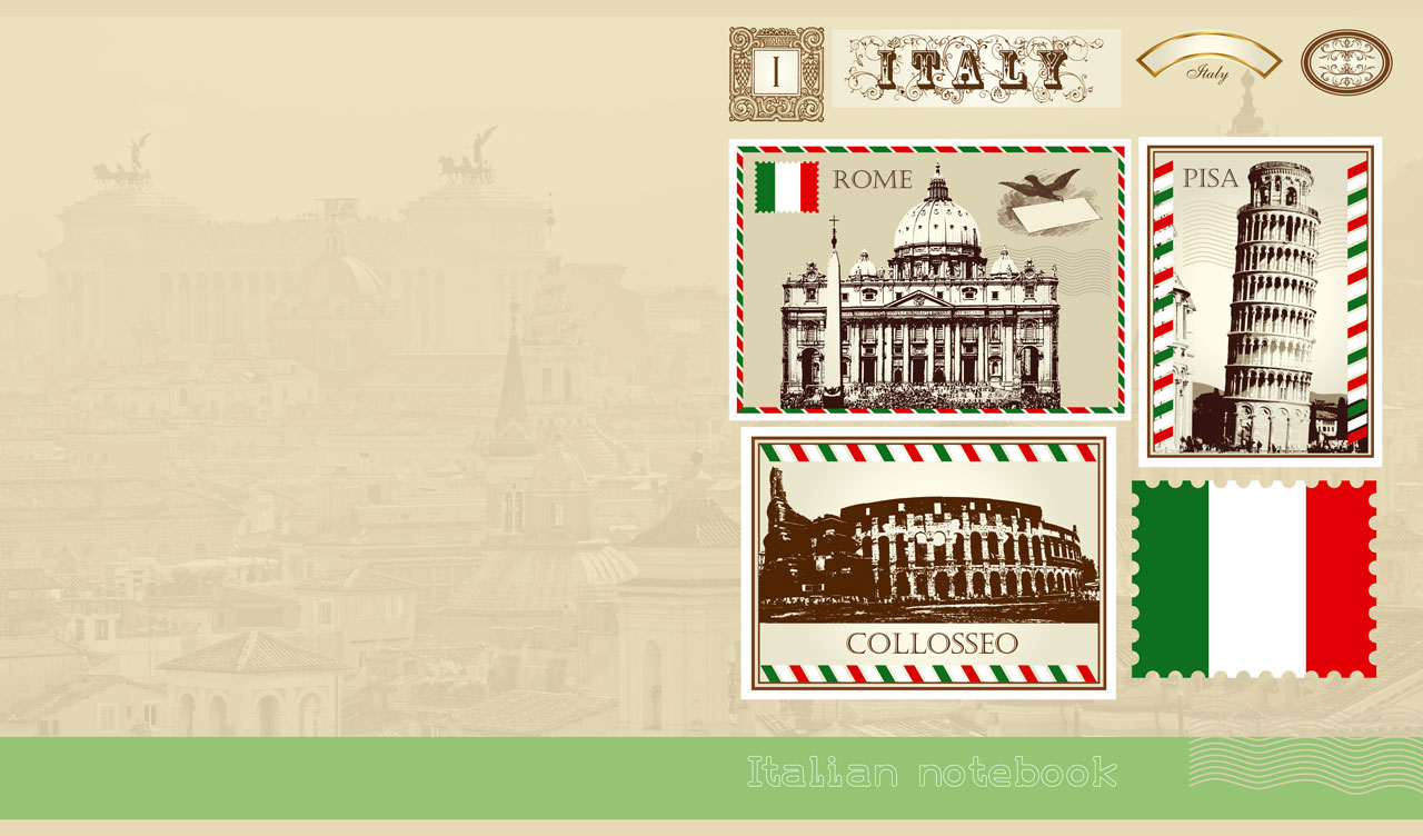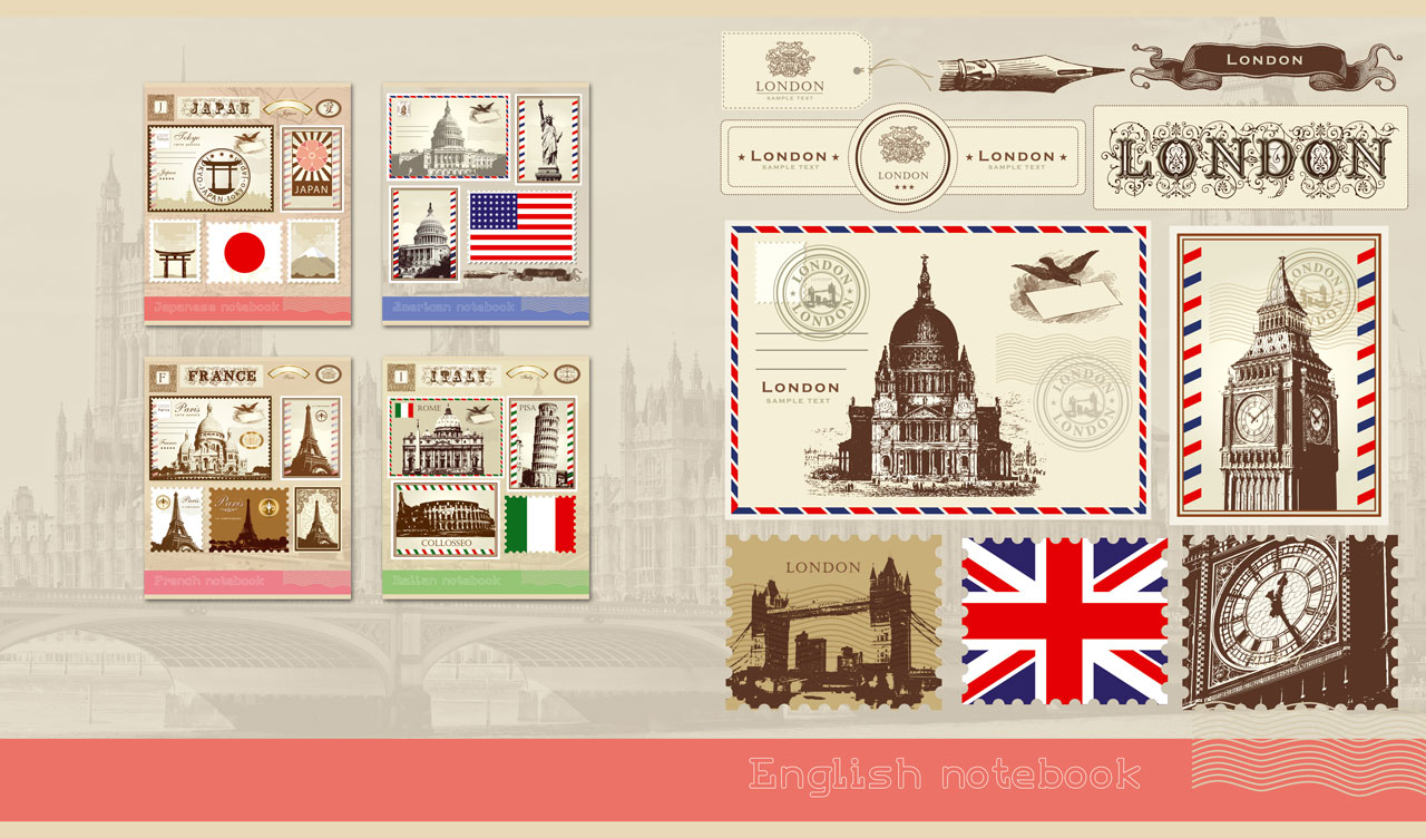 1. Famous sights of Italy on postage stamps on a faded sepia Rome cityscape 2. Famous sights of France on postage stamps on a faded sepia Paris cityscape 3. Famous sights of the US on postage stamps on a faded sepia New York cityscape 4. Famous sights of the UK on postage stamps on a faded sepia London cityscape 5. Famous sights of Japan on postage stamps on faded sepia Hirosaki Castle scenery