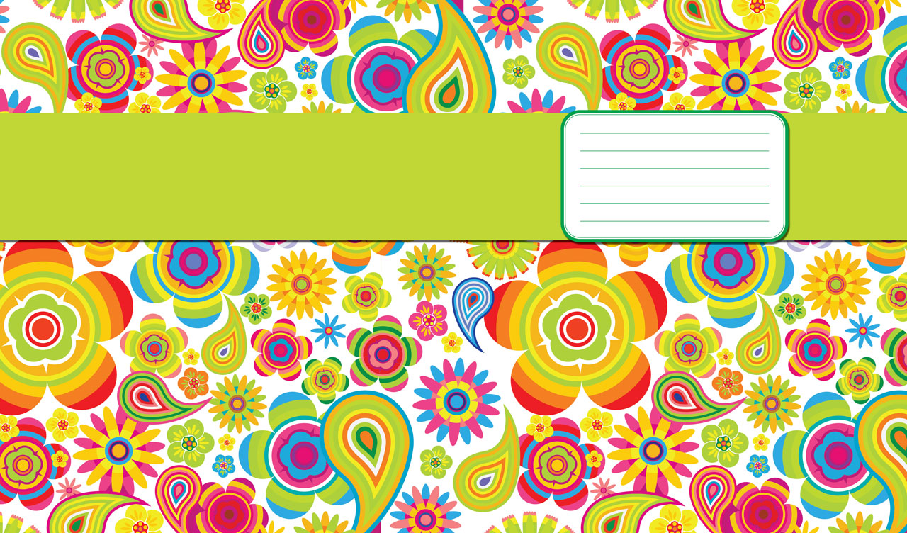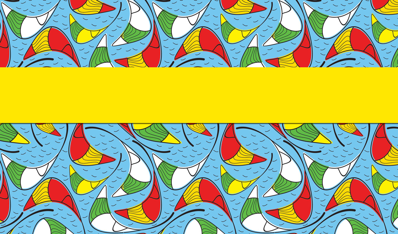 1. Purple horizontal stripe on a mix of multicolored seamless citrus pattern 2. Blue horizontal stripe on a mix of multicolored seamless floral pattern 3. Lime horizontal stripe on a mix of multicolored floral and leaf seamless pattern 4. Yellow horizontal stripe on a mix of multicolored fish seamless pattern on blue