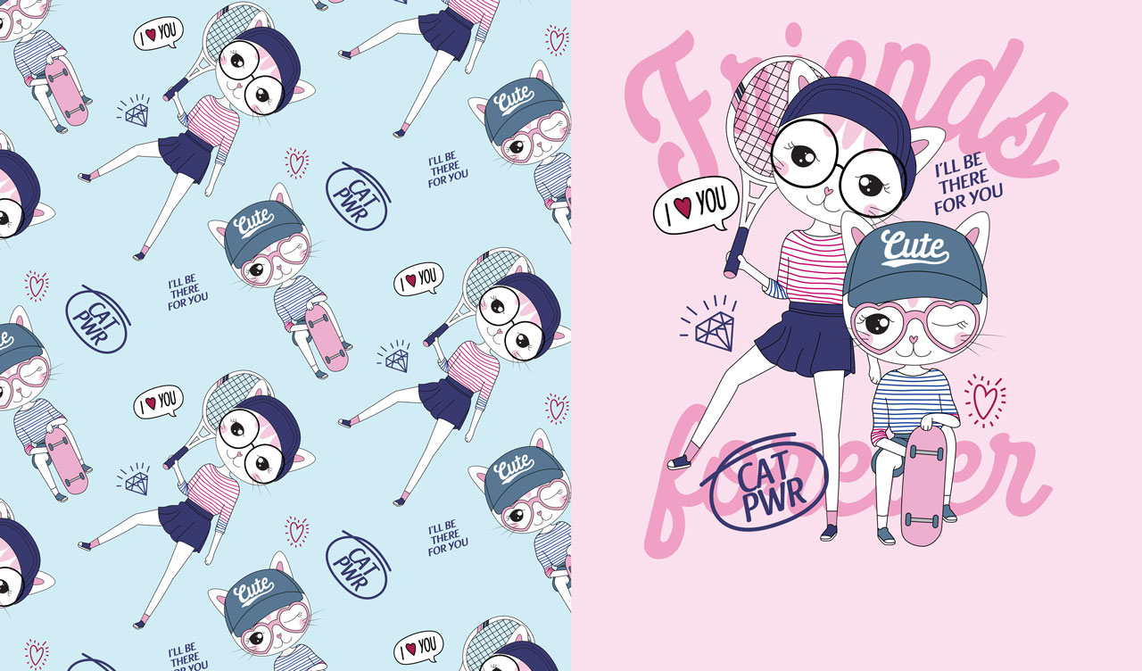 1. A photo of a smiling cat on blue next to a seamless pattern on pastel pink 2. Cat and dog dance to the music on pastel blue next to a seamless pattern on pink 3. A girl cat before and after makeup on a pink and a seamless pattern on blue 4. Sporty cat friends forever on pale pink next to a seamless pattern on sky blue 5. Photos of a cat traveling the world on blue next to a seamless pattern on pink