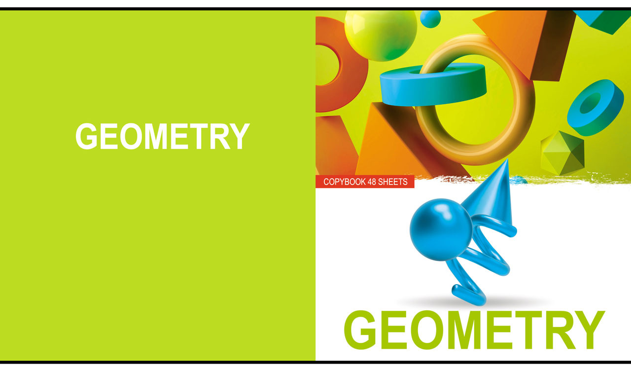 1. 3D geometric shapes on a white and lime backdrop of a Geometry notebook