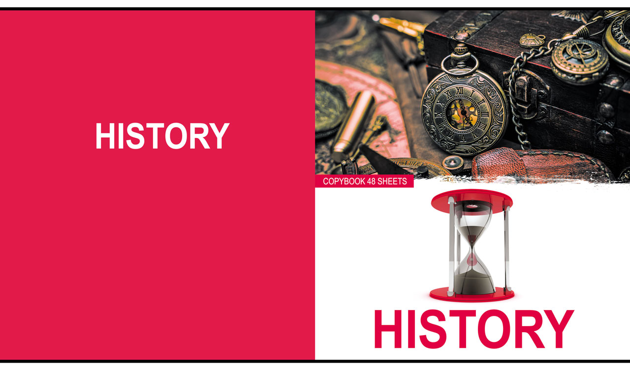 2. 3D hourglass on a white and pink-red backdrop of a History notebook