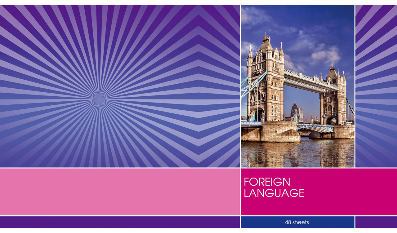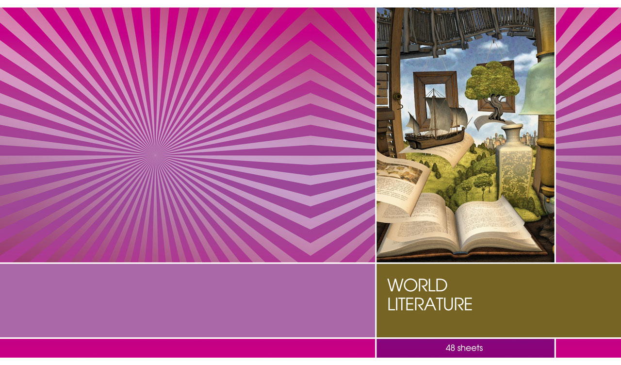 1. Biology notebook with a lady bug and a flower on a yellow-green sunburst cover 2. Chemistry notebook with molecular structures on a light blue sunburst cover 3. Foreign language notebook with the Tower Bridge on a violet sunburst cover 4. World Literature notebook with books and hills on a dark fuchsia sunburst cover