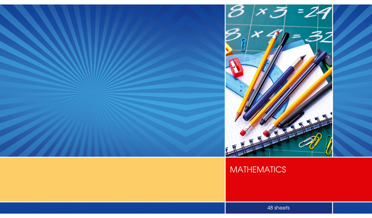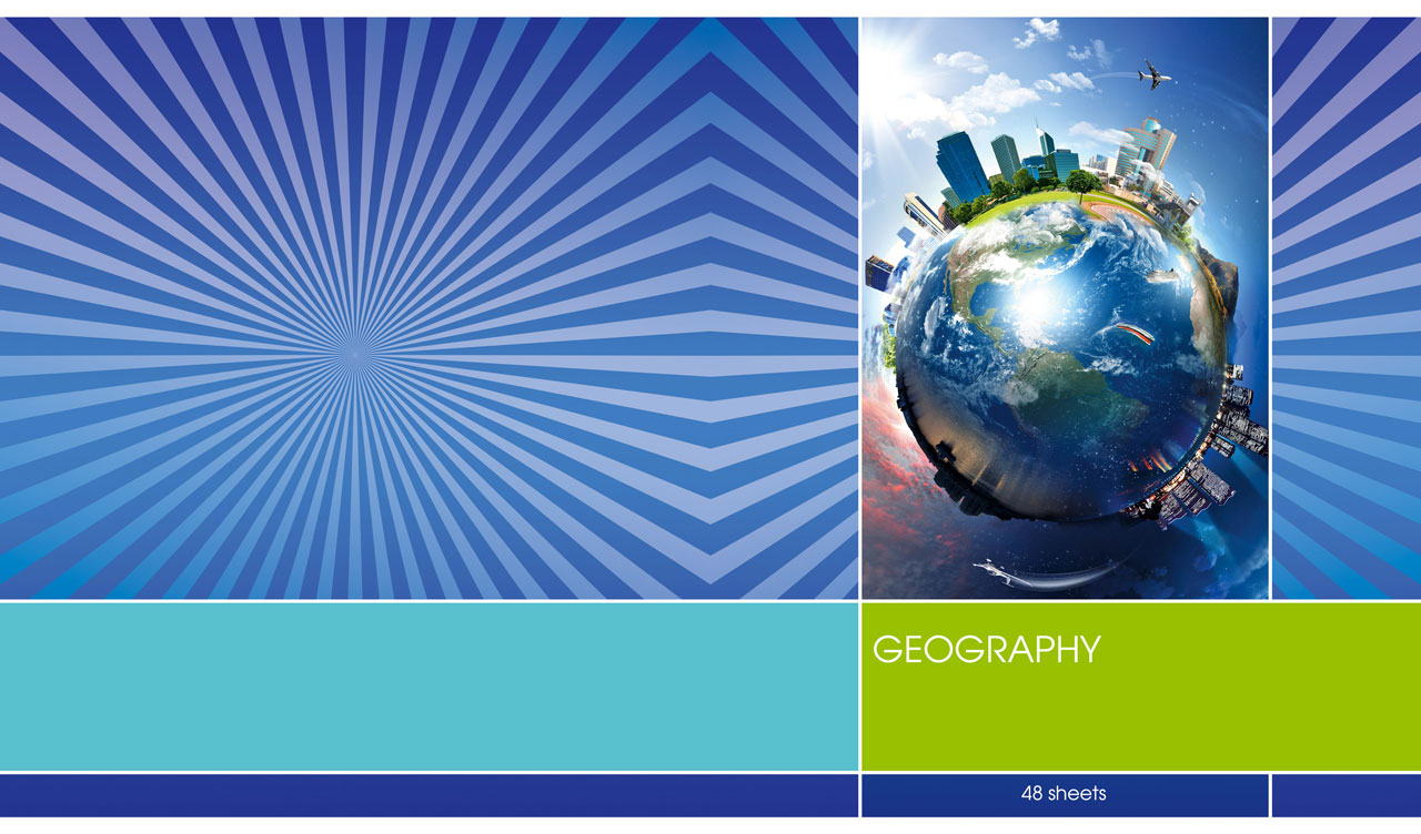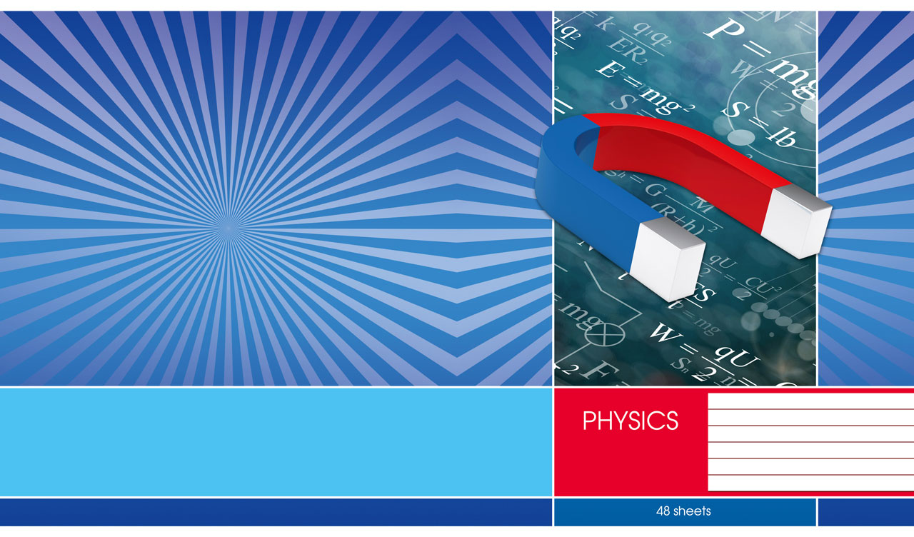 1. Geography notebook with skyscrapers on Earth on a blue sunburst cover 2. History notebook with a vintage set on an orange sunburst cover 3. Math notebook with a school stationery set on a blue sunburst cover 4. Physics notebook with a magnet and formulas set on a navy blue sunburst cover