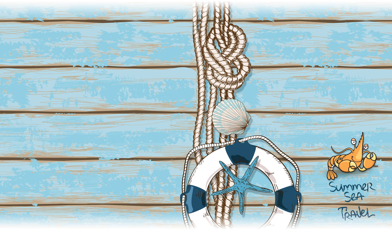 1. Illustration of starfish and shells on pastel teal weathered boardwalk 2. Illustration of a lobster and life ring on pastel blue weathered boardwalk 3. Illustration of a crab and life ring on a tan weathered boardwalk 4. Illustration of a sea turtle and helm on a beige weathered boardwalk