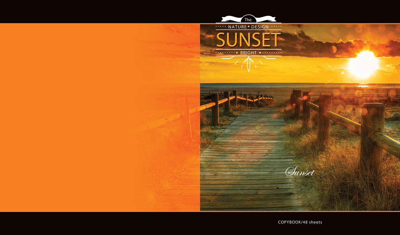 1. Sunset and a wooden walkway to sea against orange and black background 2. Sunset in the hazy valley on violet and black background 3. Sunset on a palm beach against blue and black background 4. Sunset on a sandy coastal line against red and black background