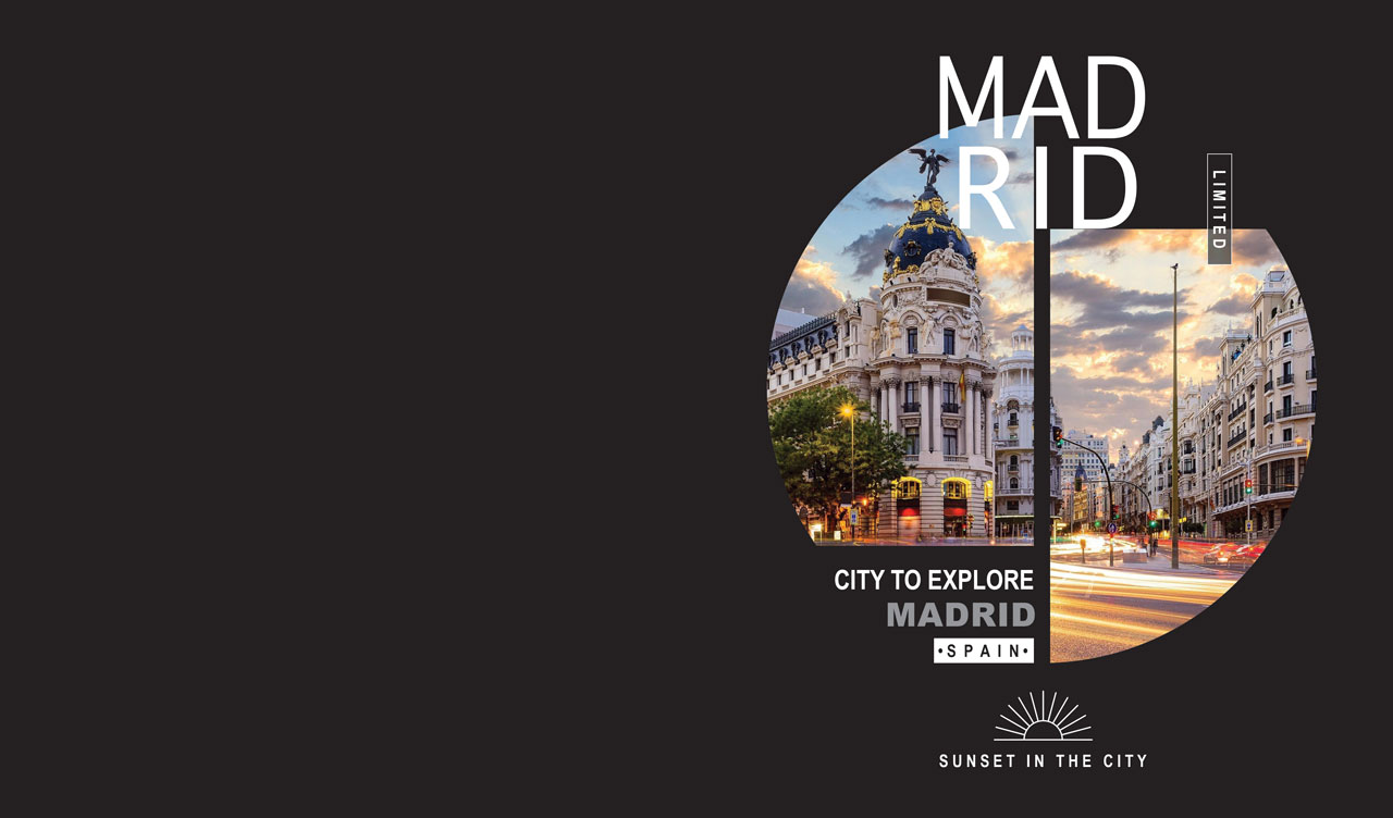 1. The Metropolis Building in Madrid in a split circle window on black 2. The Eiffel Tower in Paris in a split circle window on black 3. The illuminated London Bridge in a split circle window on black 4. The illuminated Berliner Dom in a split circle window on black 5. The illuminated Colosseum in a split circle window on black