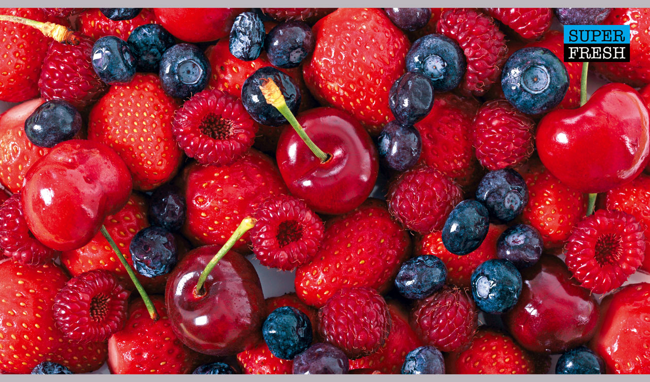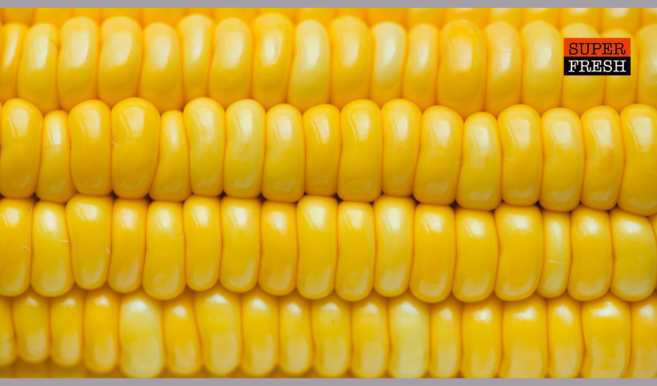 1. Super fresh and glossy rows of yellow corn kernels close-up view 2. Super fresh berries and cherries close-up view in red and blue shades 3. Super fresh mixed nuts close-up view in tan and brown shades 4. Super fresh multicolored delicious candy balls close-up view 5. Super fresh and red strawberries close-up view