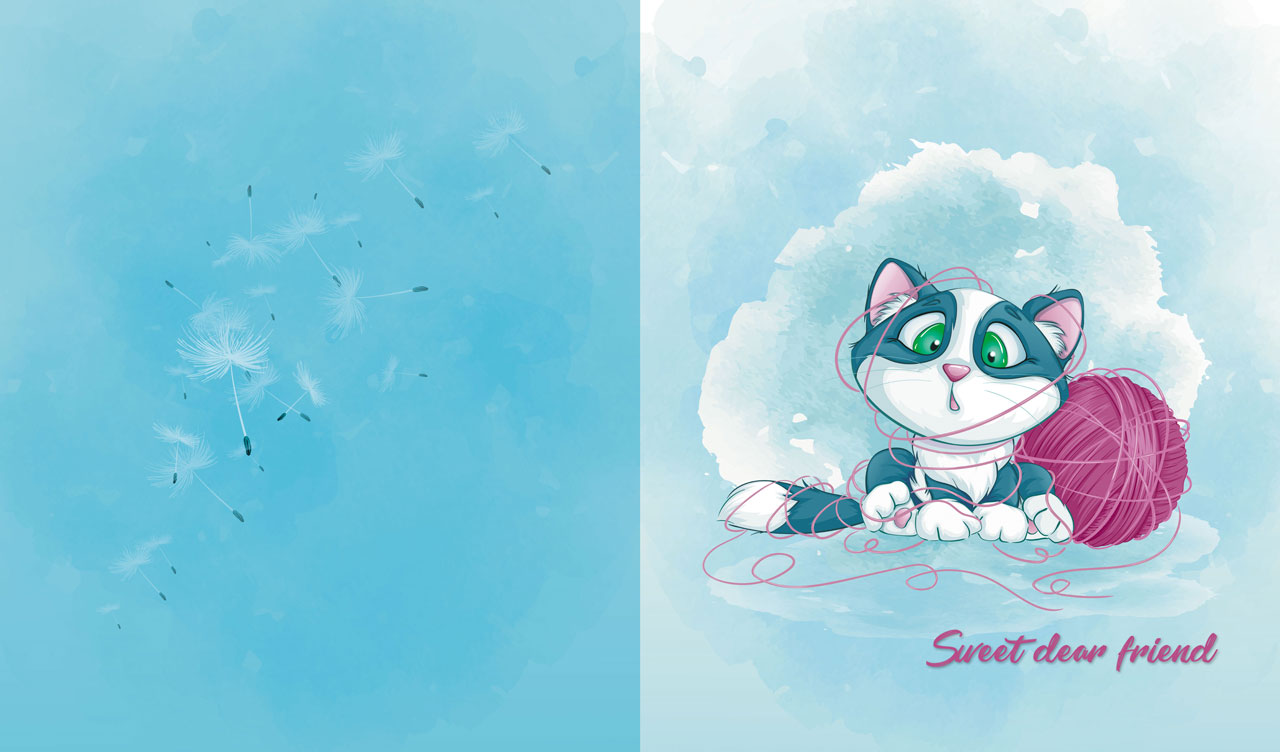 3. A sweet cartoon kitten plays with a yarn ball on a baby blue watercolor backdrop