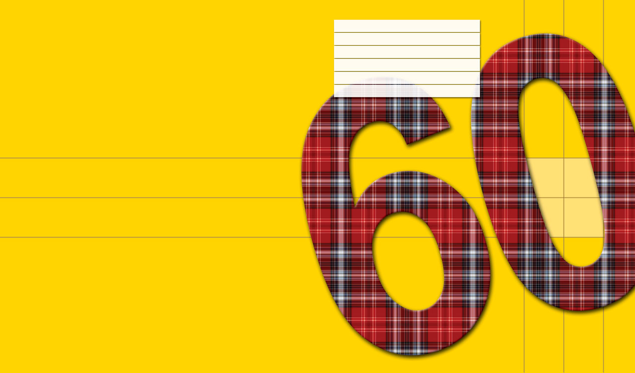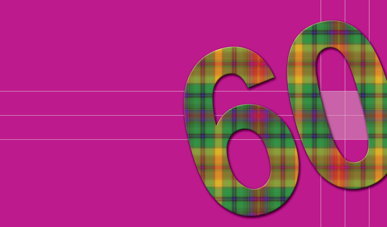 1. Red and white plaid patterned number sixty on a red page 2. Green, blue and yellow patterned number sixty on a purple page 3. Red, white and dark blue patterned number sixty on a blue page 4. Red, black and white patterned number sixty on a yellow page