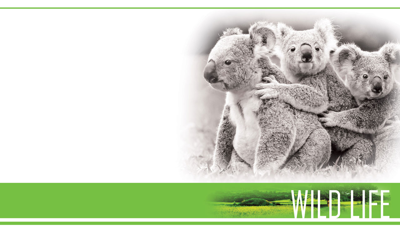 Black and white closeup of three koalas hugging on the grass against a white background with a lime-green wild life footer.