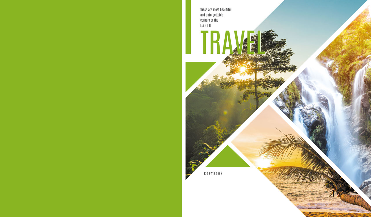 1. Collage of scenic landscapes on a white and lime cover of a travel magazine