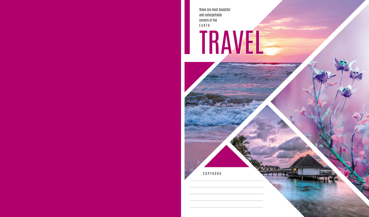 5. Collage of scenic landscapes on a white and fuchsia cover of a travel magazine