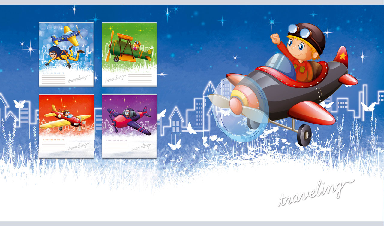 1. Drawing of a plane journey on the background of red and white gradient night sky 2. Drawing of a plane and skydiver of light blue and white night sky above the field 3. Drawing of a plane journey on the background of blue and white night sky 4. Drawing of a plane journey on the background of purple and white night sky 5. Drawing of a plane journey on the background of green and white night sky