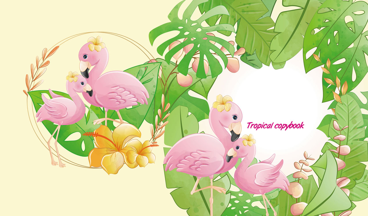 2. Pink flamingos among tropical plants on a pastel yellow backdrop