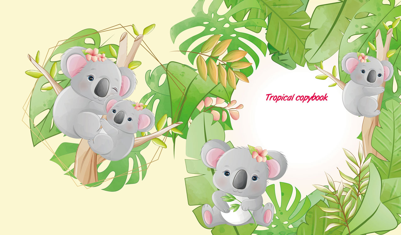 3. Grey koala bears among tropical plants on a pastel yellow backdrop
