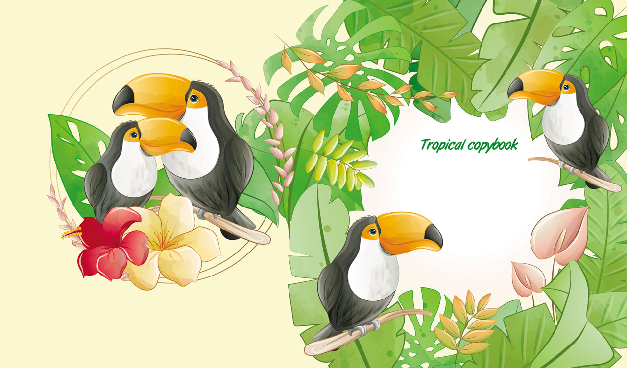 4. Black and white toucans among tropical plants on a pastel yellow backdrop