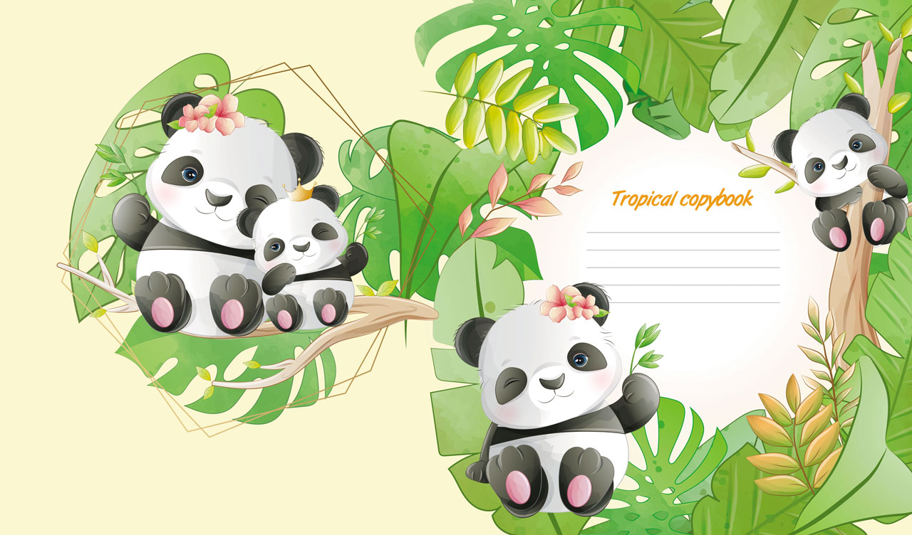 5. Black and white pandas among tropical plants on a pastel yellow backdrop