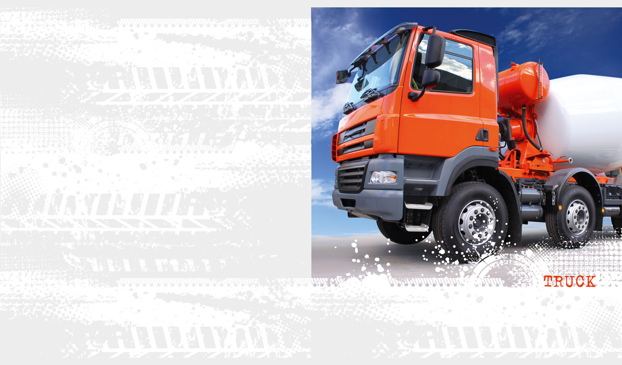 1. Big blue semi-truck on a sunny road against a white background with tire tracks 2. Teal semi-truck in motion against a white background with tire tracks 3. Red cement truck on a sunny road against a white background with tire tracks 4. Sky blue American truck on the road against a white background with tire tracks 5. Red special mission truck against a white background with tire tracks