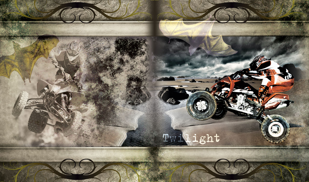 1. Rider jumps over a rocky beach at sunset in a tan frame with bird silhouette 2. Bike and off-roader hop across the dessert in a pink frame with bat silhouette 3. Red ATV moves along a sandy beach at twilight in sepia frame with bat silhouette 4. Dirt bike rider stands on beach at twilight in a brown frame with bat silhouette