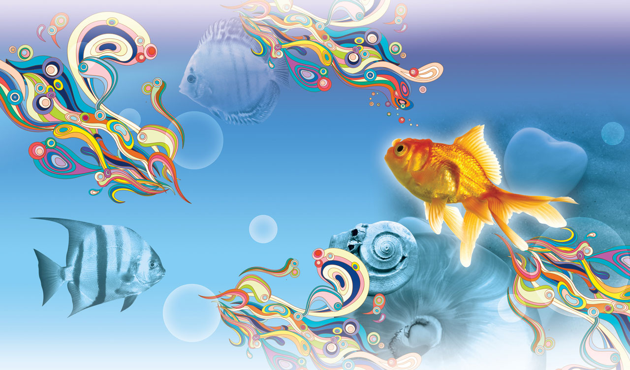 1. Gray angelfish in the teal blue sea with seashells and vivid abstract seaweed 2. Fantail goldfish in the purple-blue sea with seashells and vivid abstract seaweed 3. Goldfish couple in the navy-purple sea with seashells and vivid abstract seaweed 4. Calico fantail goldfish in a blue sea with seashells and vivid abstract seaweed