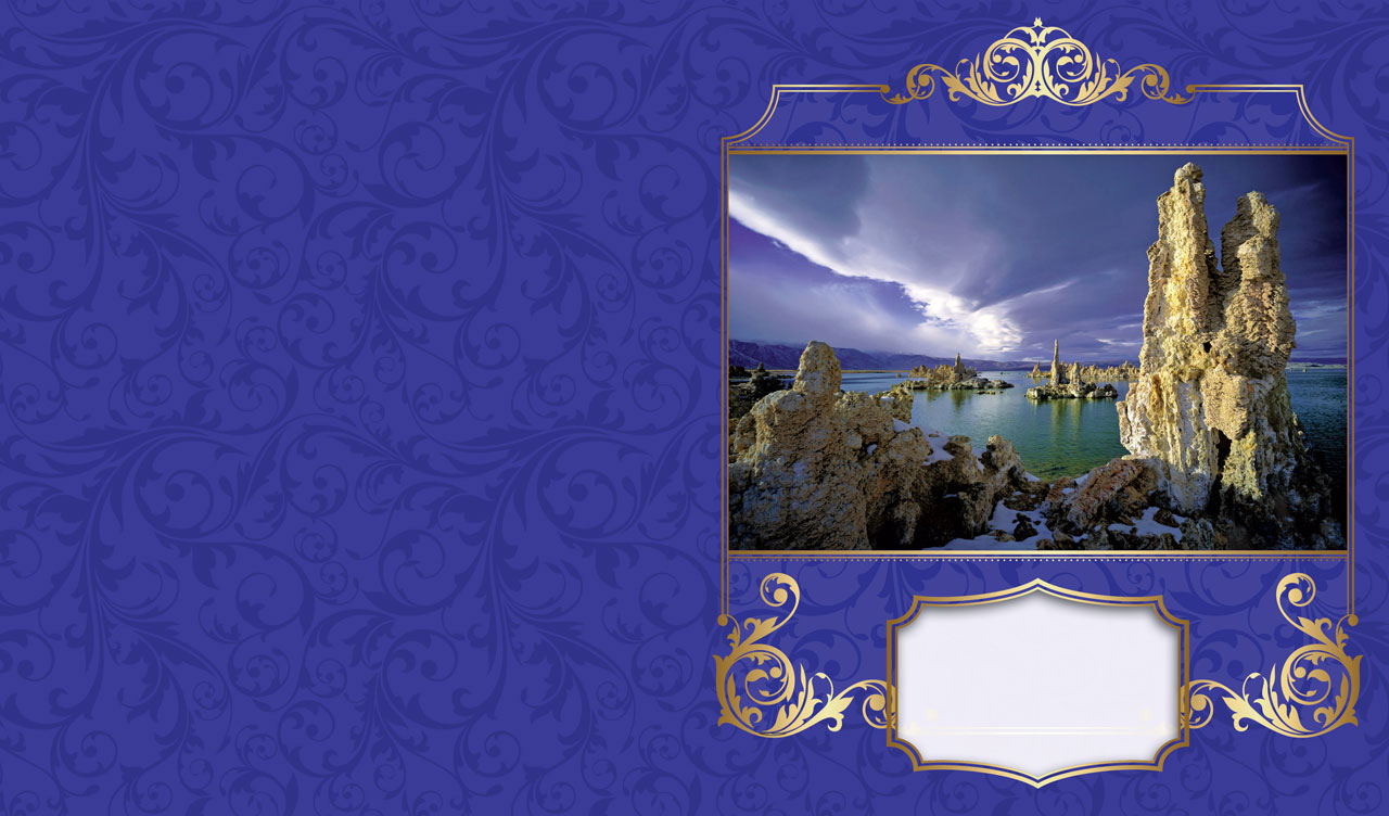 1. Limestone towers at Mono Lake landscape in a gold frame on a navy backdrop